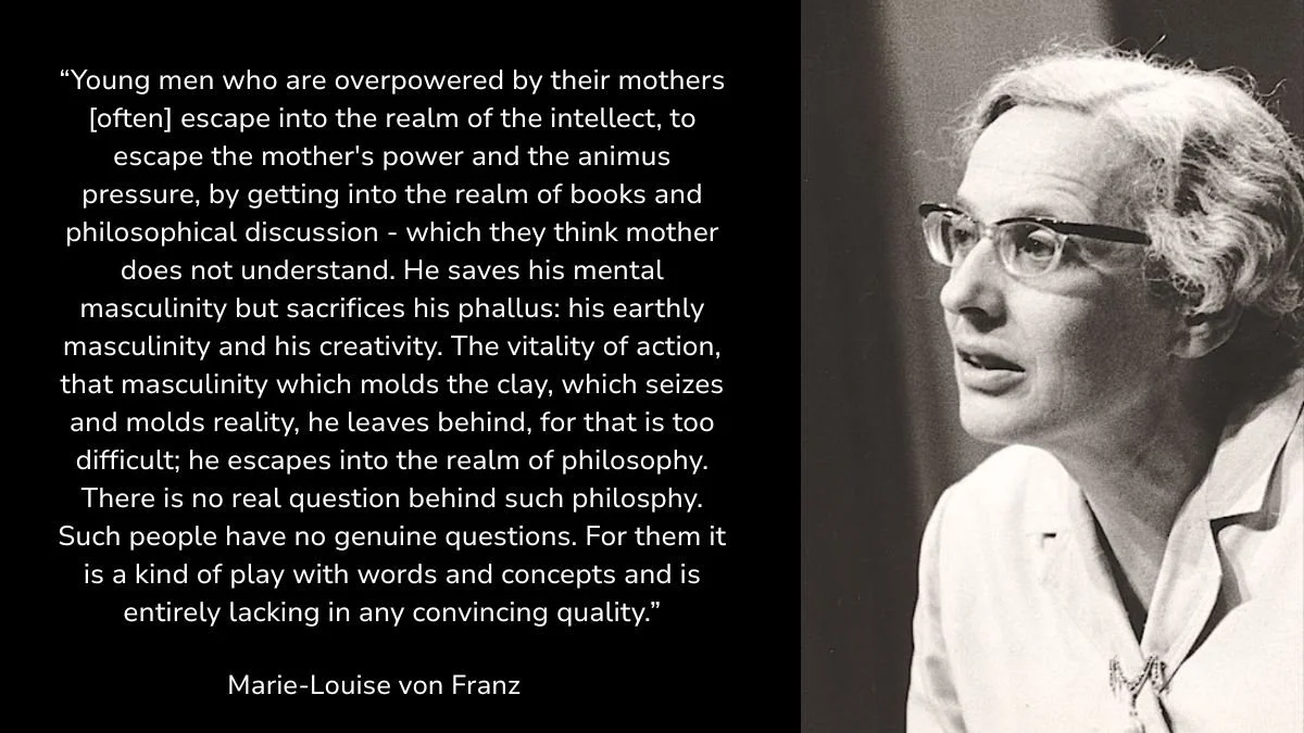 This is the earthly masculinity that Franz spoke about that is missing for so many young men. Loyal to their mother complex, they are often suspicious of men.
